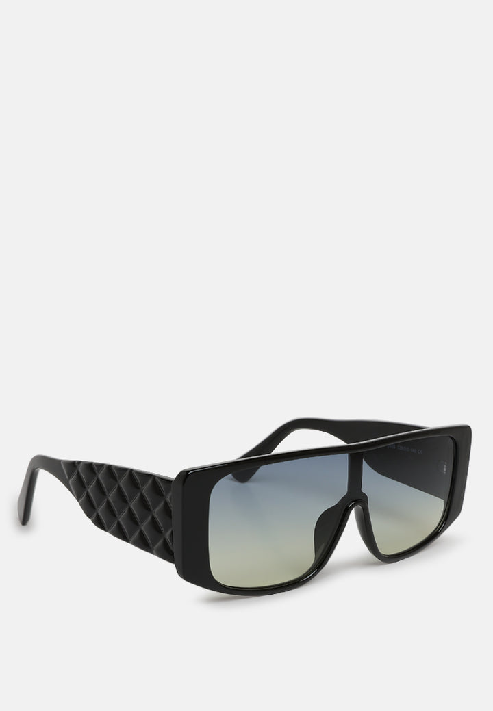 The oversized sunglasses are bold with intriguing cushion textured temples that elevate the overall silhouette of the sunglasses. The polycarbonate material is durable while the tinted lenses have UV protection.