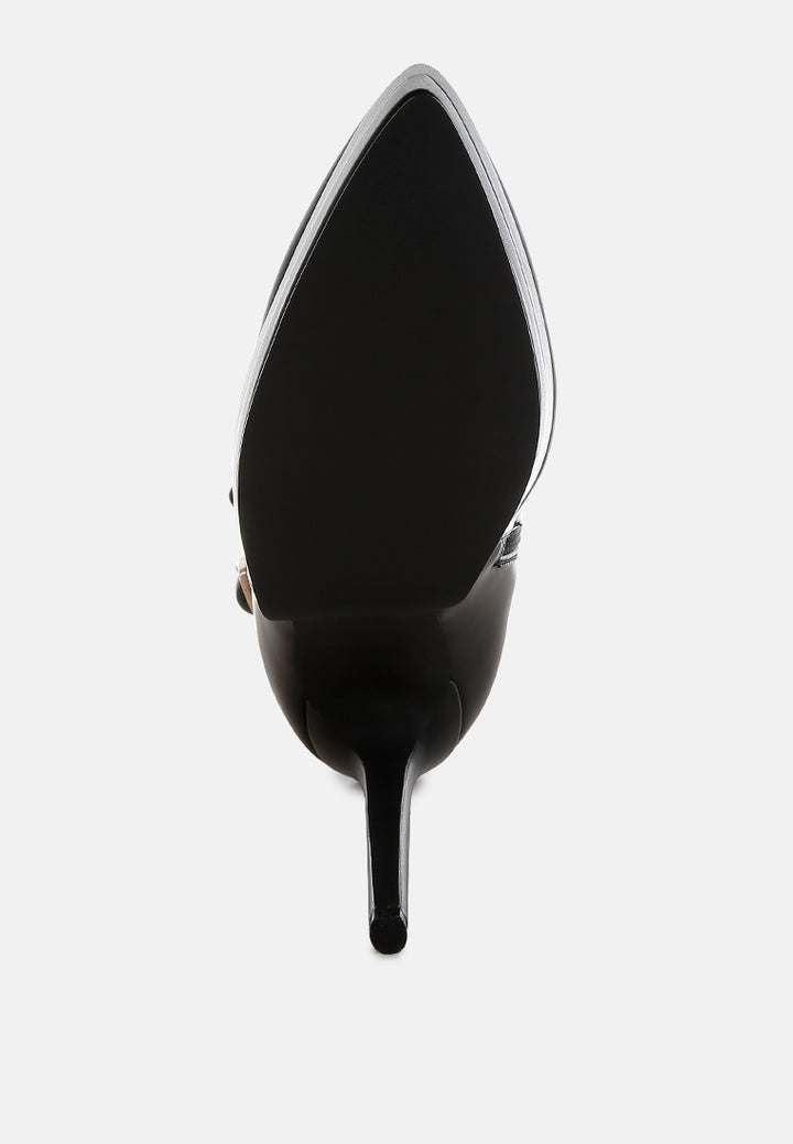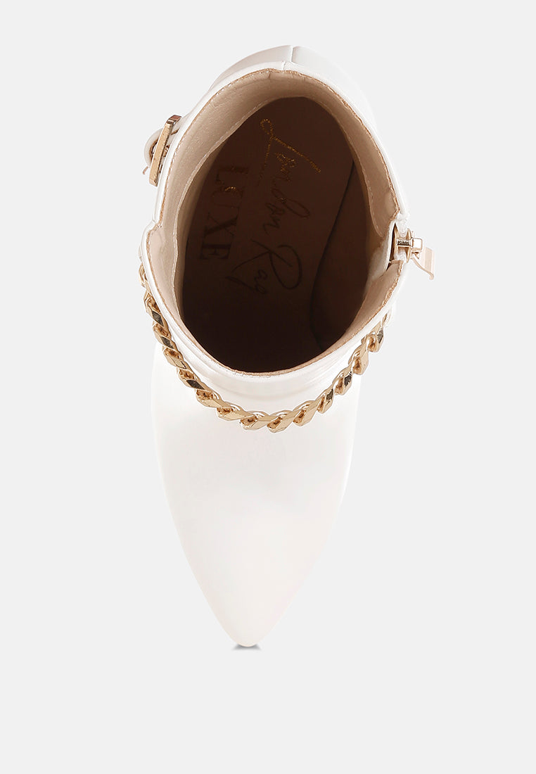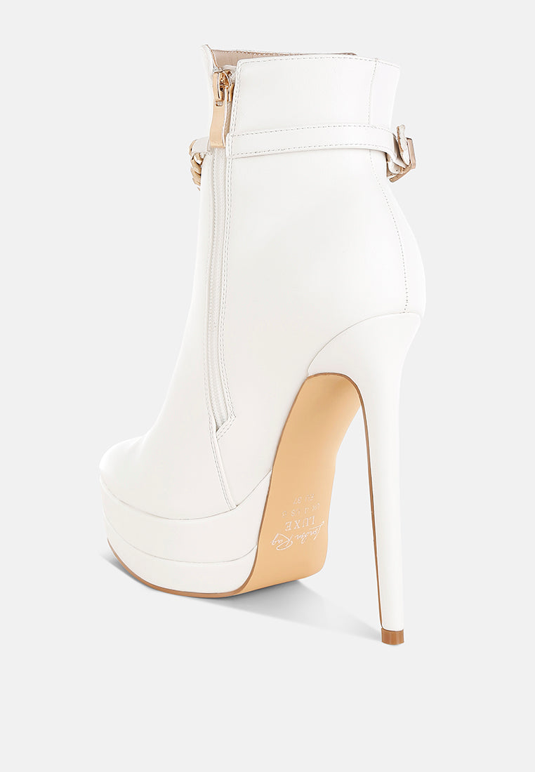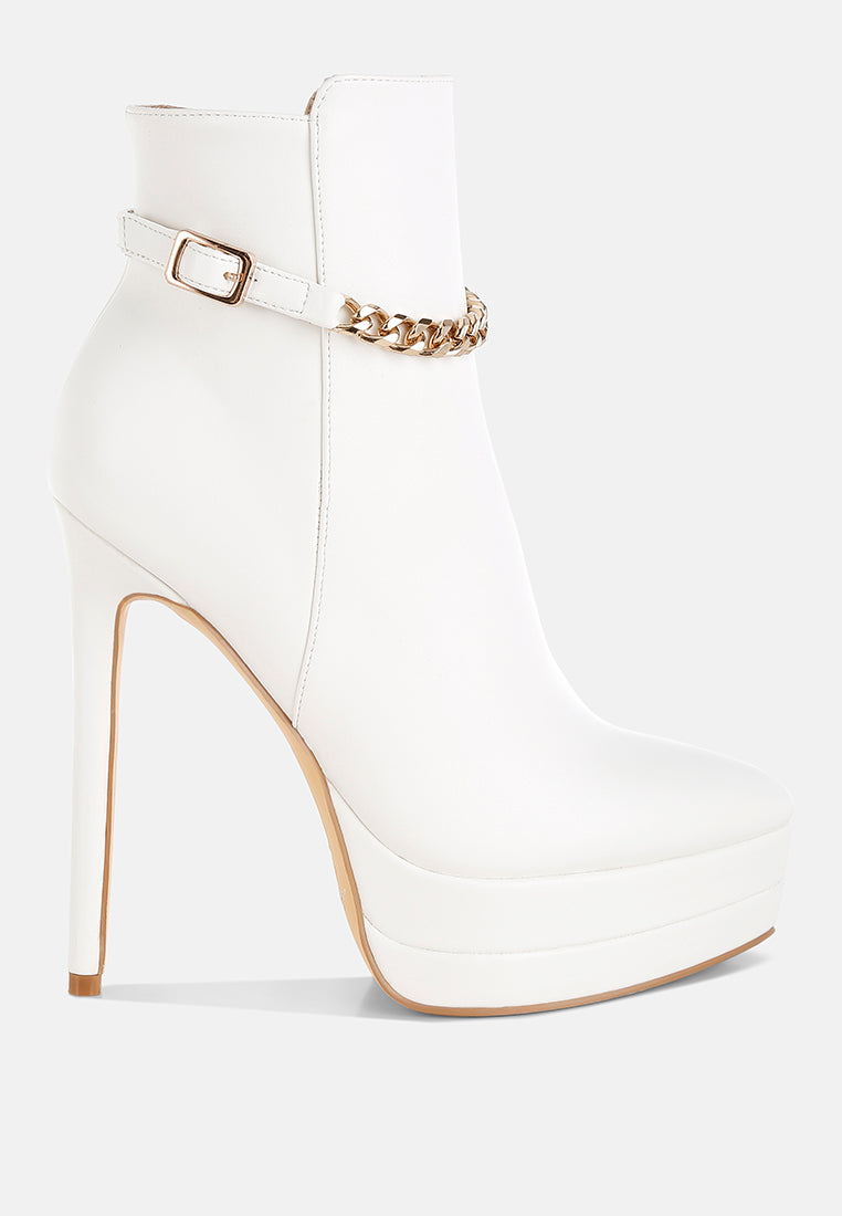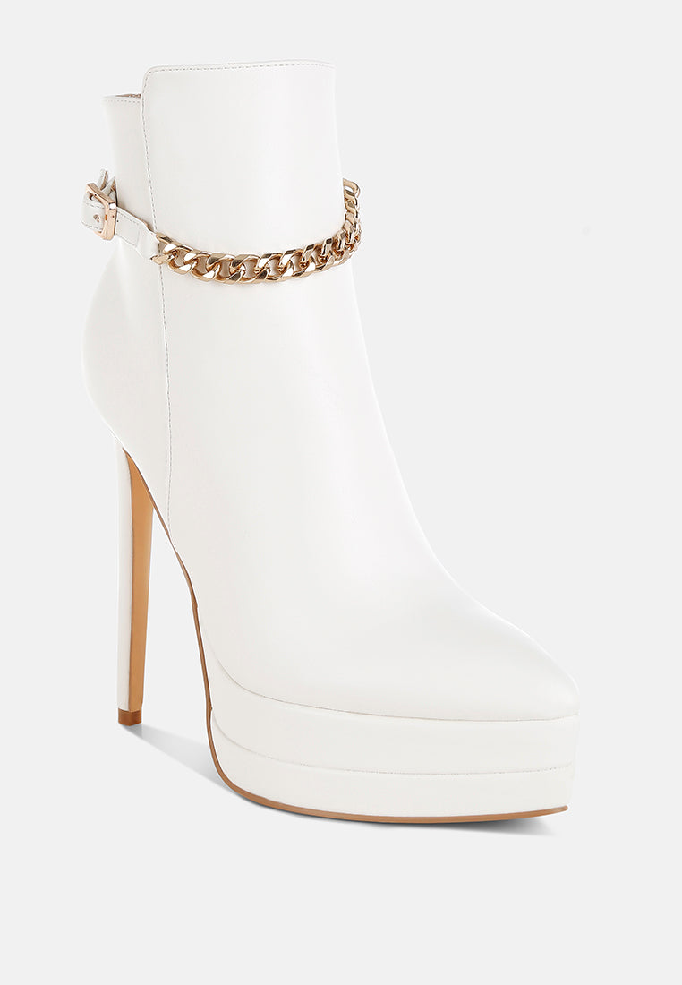Sophisticated flair in every step, the high heeled stiletto boots are ravishing with the subtle yet blingy metallic chain detail. The double stack platform detail adds another level of elevation which is alluring. The boots have comfortable cushion insoles that cut strain and a zipper closure which is convenient and offers an easy to wear experience.