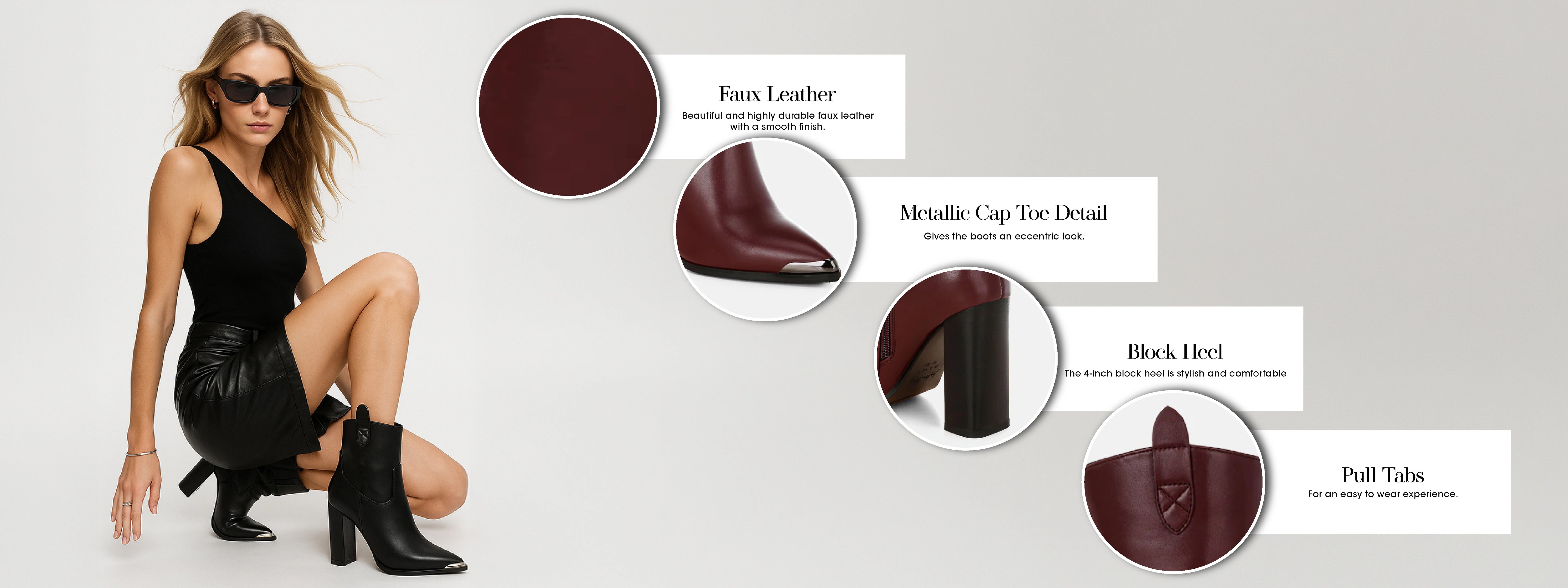 Channel that boss girl energy with these pointy toe faux leather boots. The block heel exudes an elevated vibe while the paneling detail adds a hint of contrast. Team these with your bodycon dresses for a look that demands attention.