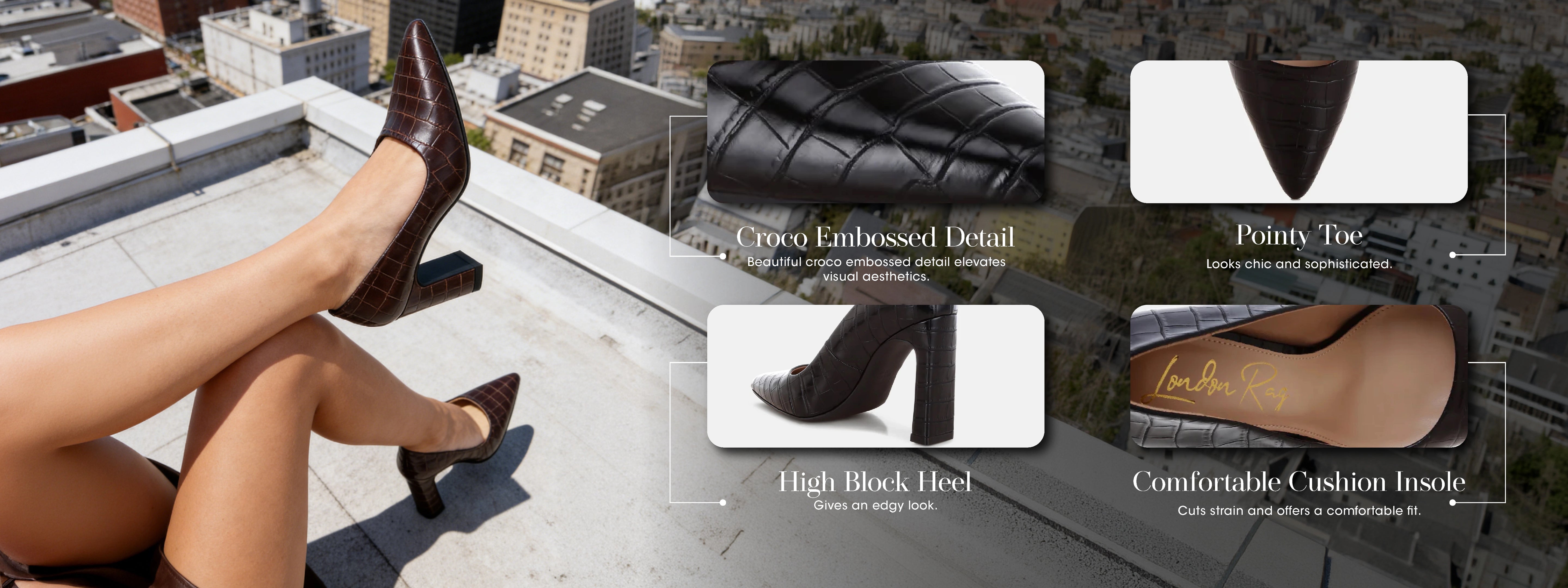 Croco faux leather court shoes with a clean pointed toe and a slim but steady block heel. Graceful enough for work, chill enough to wear past 6 pm. Comfort included.