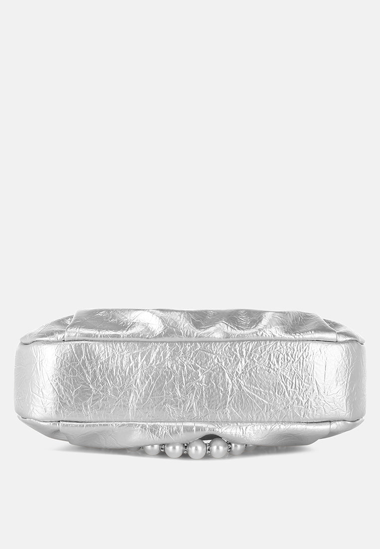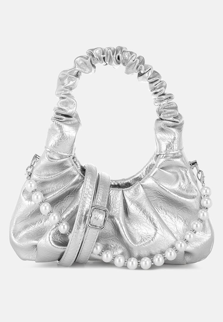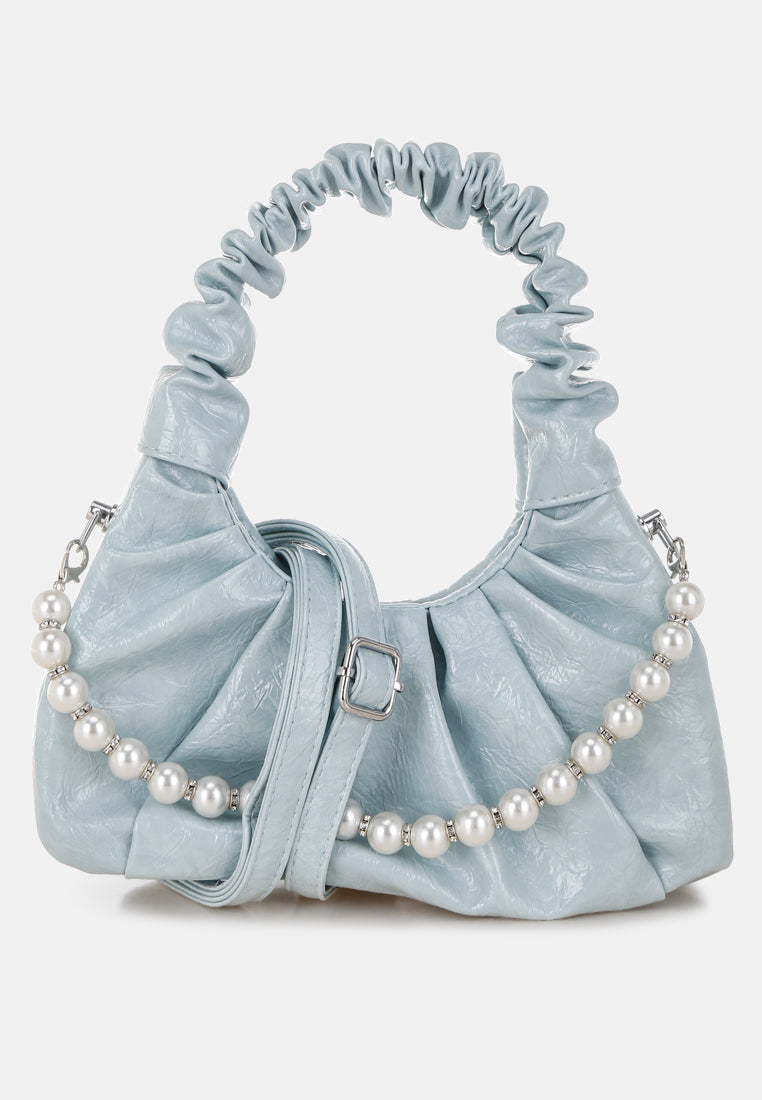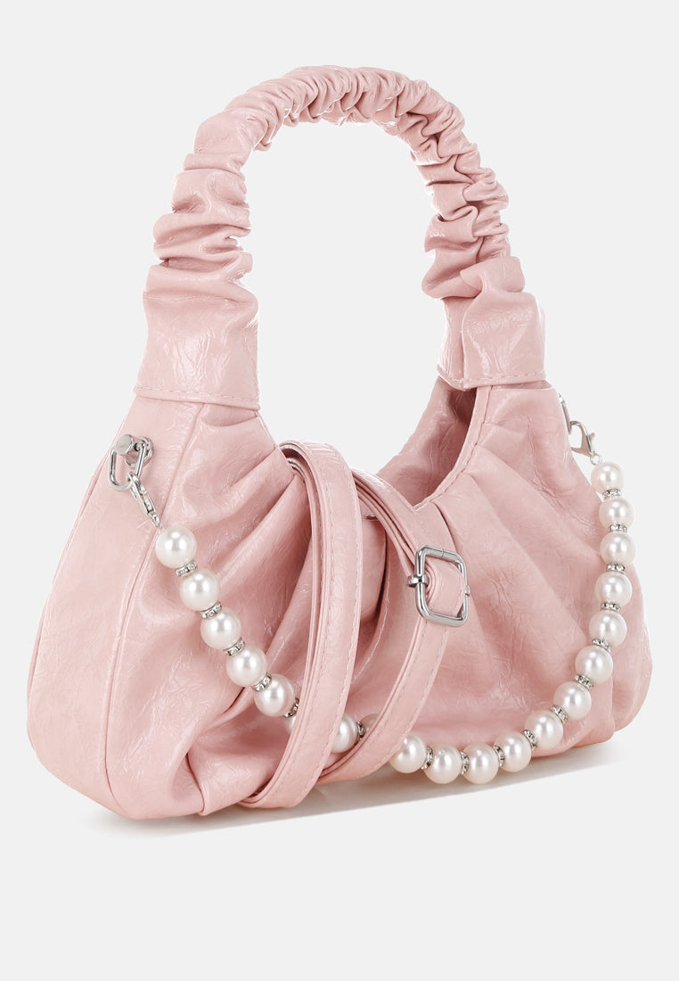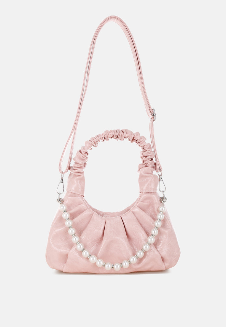 Add a touch of charm to your look with this crossbody bag designed with a ruched top handle and a detachable pearl strap for added elegance. The zip closure ensures your essentials stay secure. It is ideal for brunches, parties, or casual outings.
