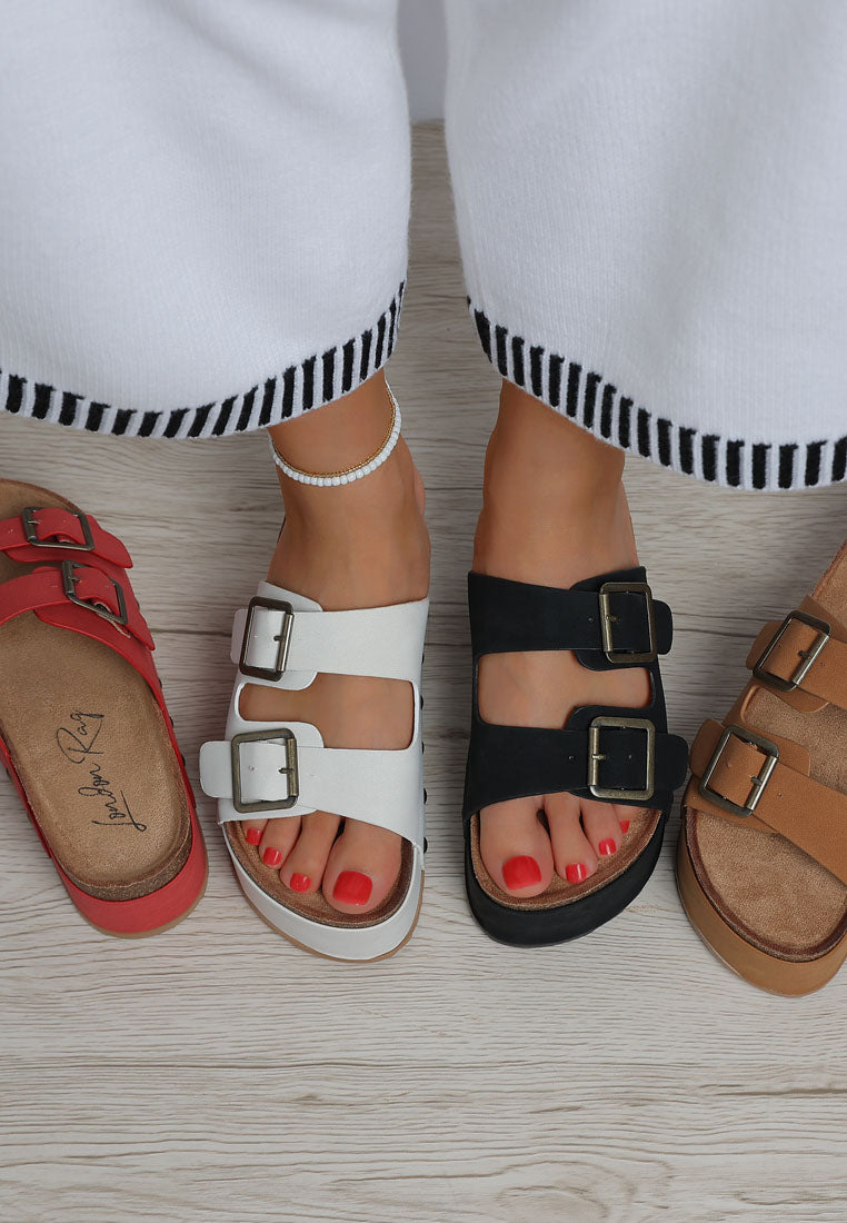 Are you even living in the 21st century modern era if you don't own a pair of these slip ons? Stylish, versatile, and a rad aesthetic with the cork detail and double pin buckle vamp, the pair is also comfortable with the flat platforms. The slip on design gives them an easy to wear experience, perfect for daily wear. A personal styling tip? Pair them with your favorite socks for a trendy chic look!
