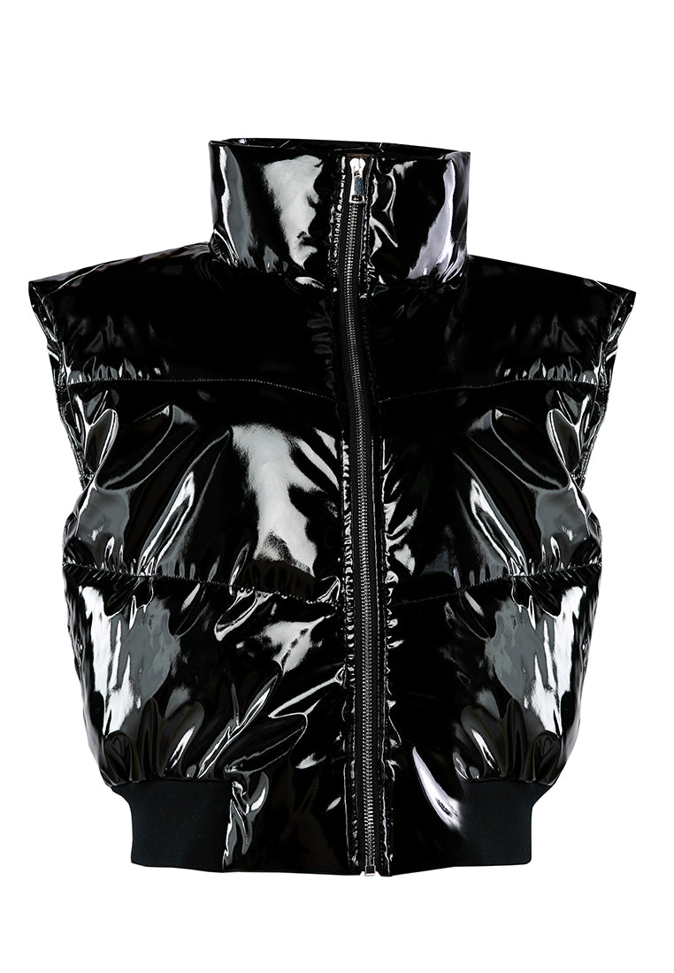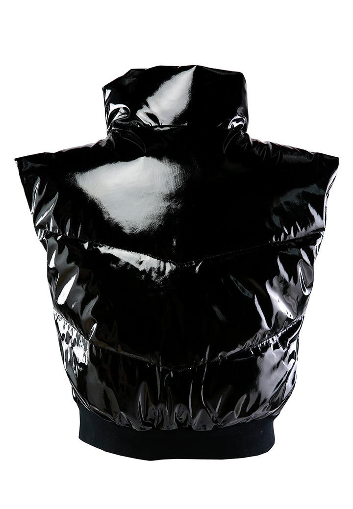 The puffer jacket is shiny, glossy, and chunky visually, with a zipper front. The wind cheater jacket is perfect for chilly weather to keep you cozy and warm while looking stylish.