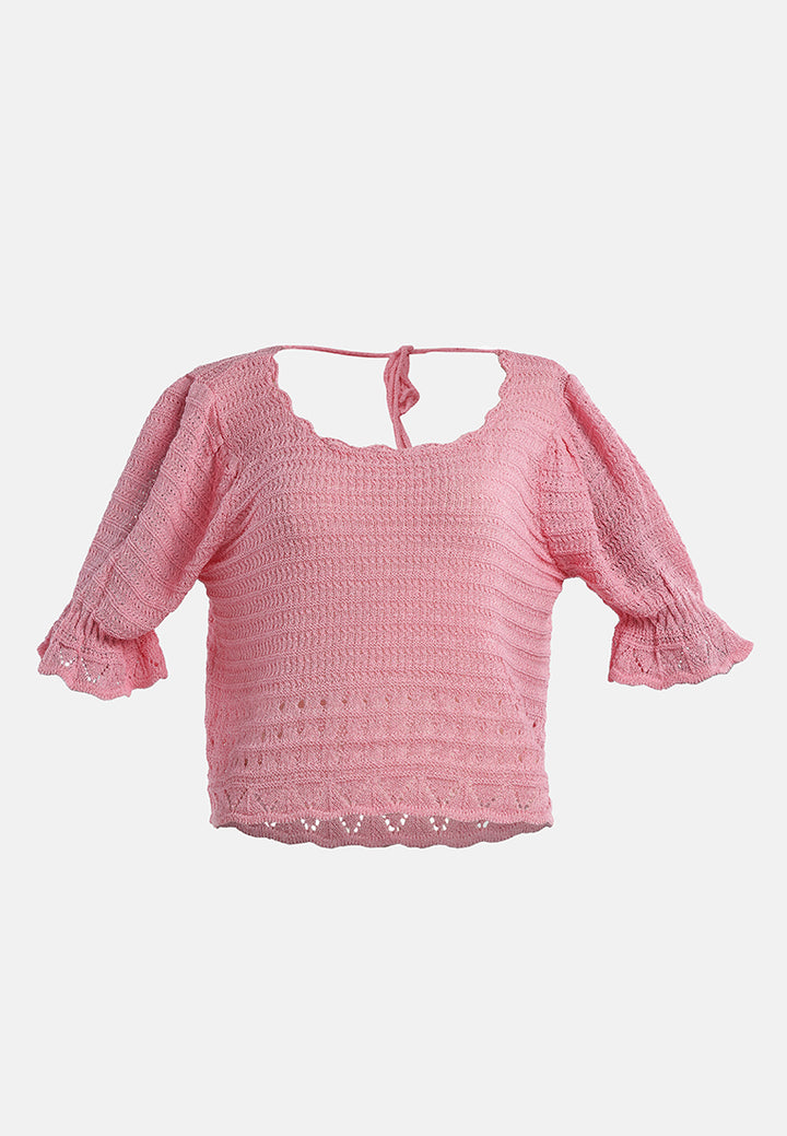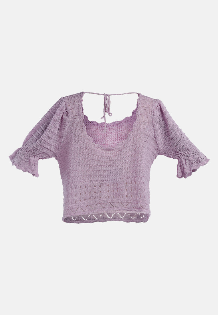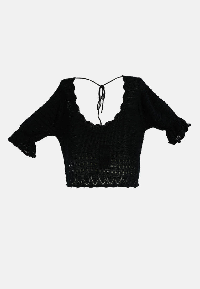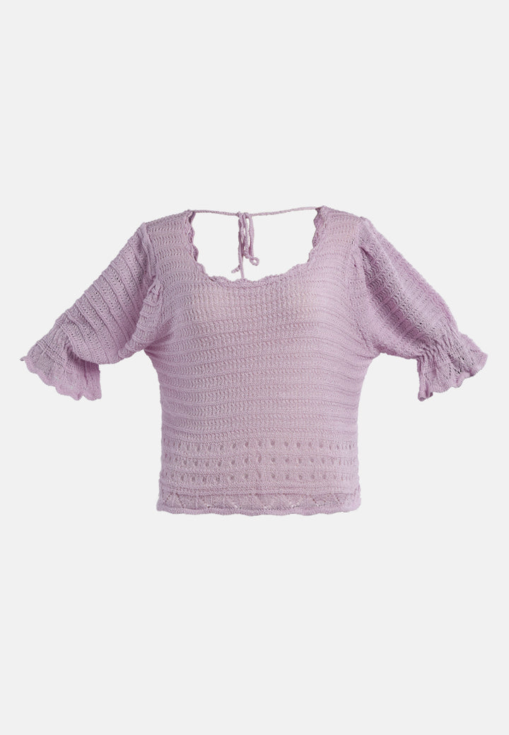 Add textures, tones, and details to your outfit this season with knitted tops. A back string is provided to adjust the fitting as per your comfort. With a Curled Rolled Hemline and a Scoop neckline, this crop top is a must-have in every woman's wardrobe. Giving you a Boho Vibe this knitted top will transform your look from ordinary to glam in just a jiffy.