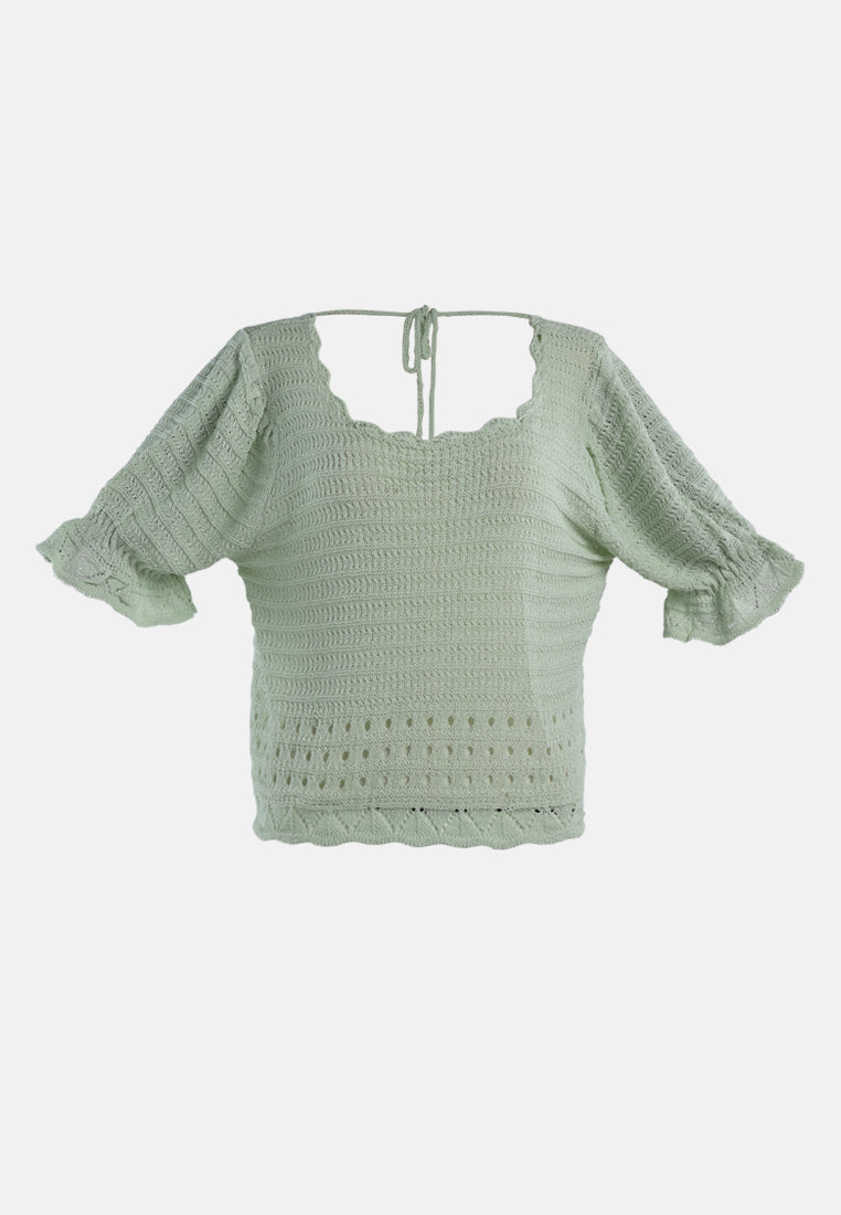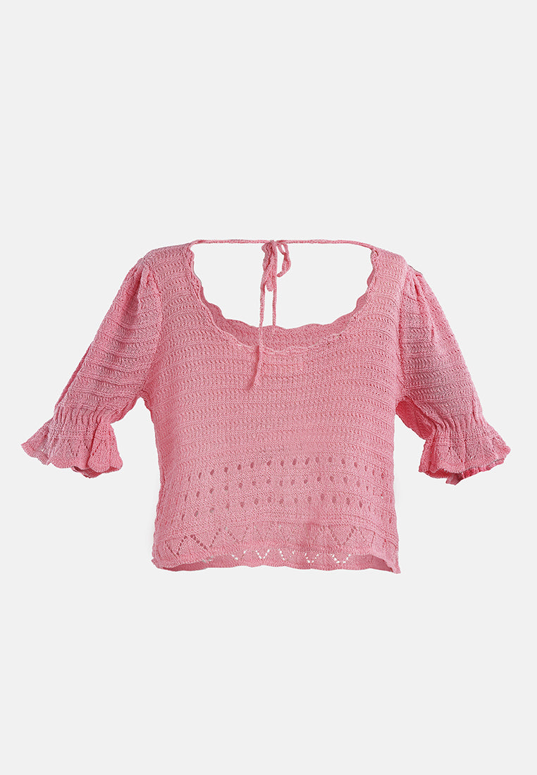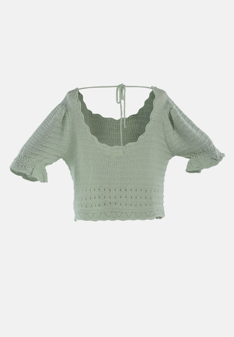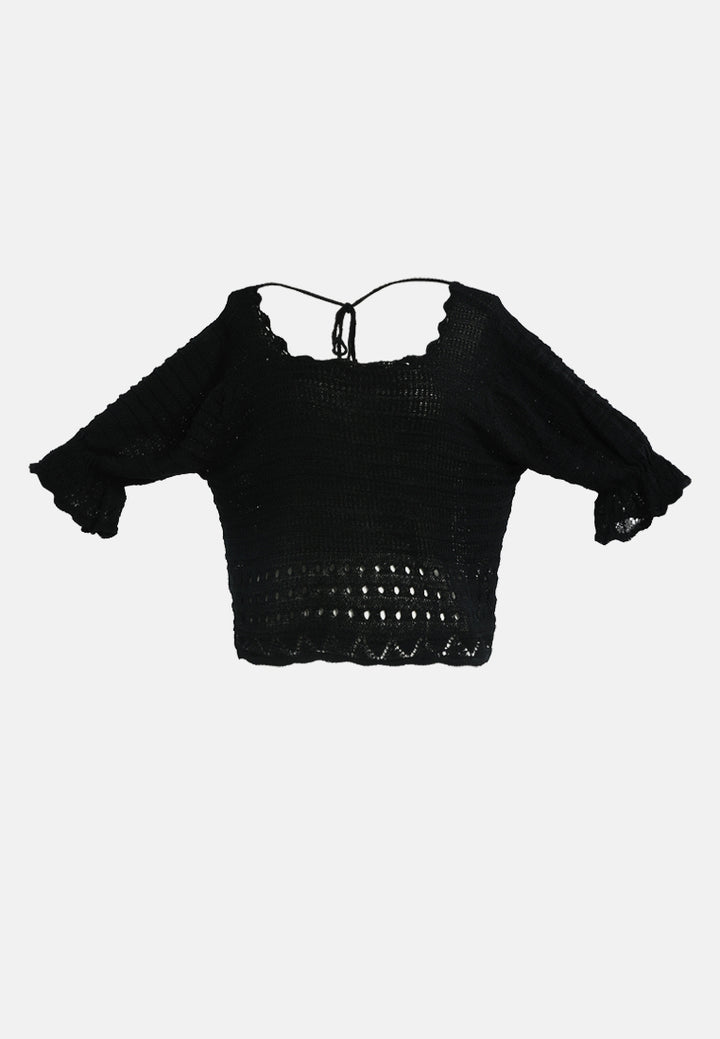 Add textures, tones, and details to your outfit this season with knitted tops. A back string is provided to adjust the fitting as per your comfort. With a Curled Rolled Hemline and a Scoop neckline, this crop top is a must-have in every woman's wardrobe. Giving you a Boho Vibe this knitted top will transform your look from ordinary to glam in just a jiffy.
