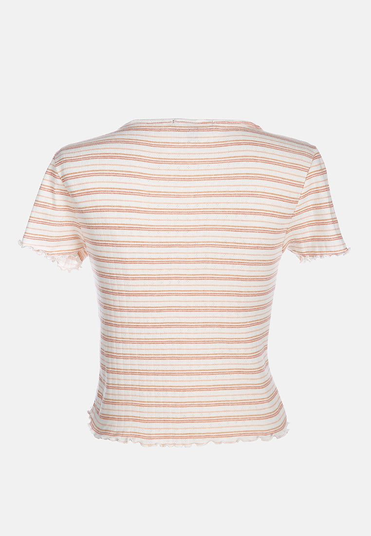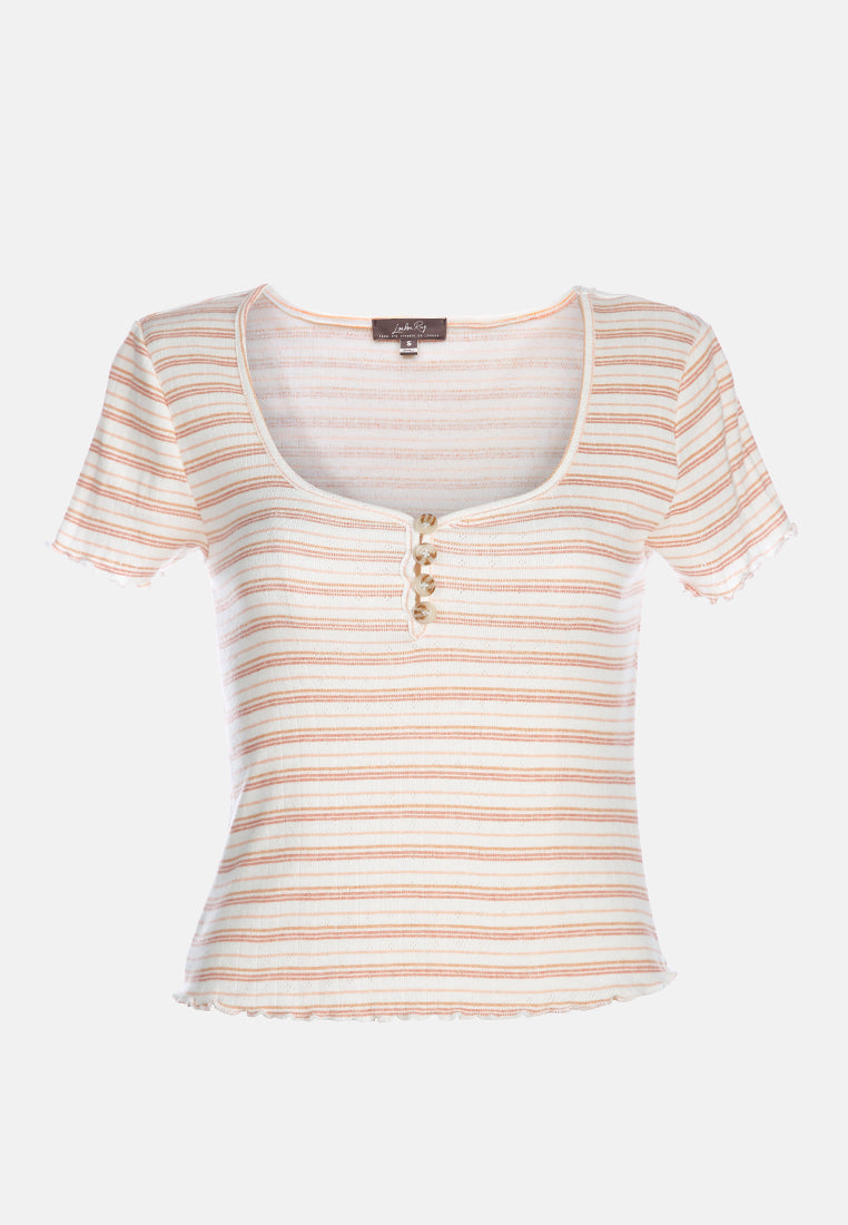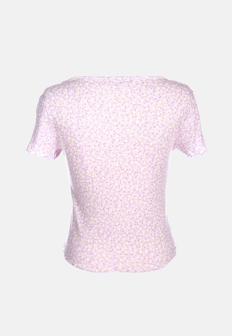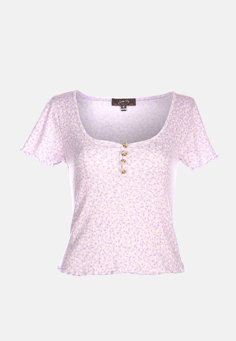 Lightweight, casual, and comfortable floral top in single knit ribbed jersey. It has curled hemline and button details. The top comes in multiple print and color options to choose from.