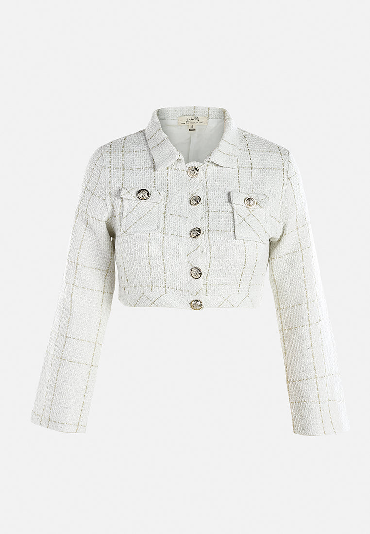 With its relaxed fit, high collar, and button-down design, this chic woven jacket blends comfort with style. The gold-tone buttons and flap breast pockets add a polished finish, making it perfect for layering over a sleeveless dress from London Rag.