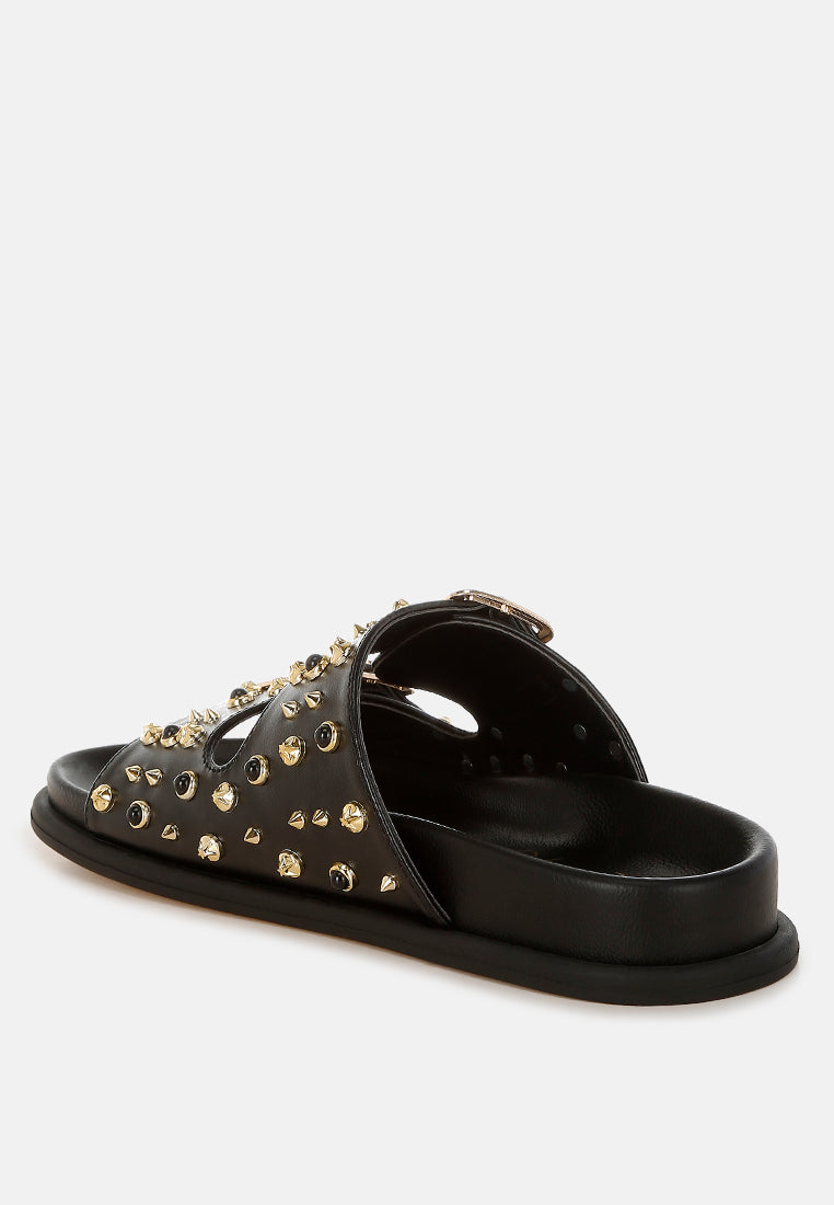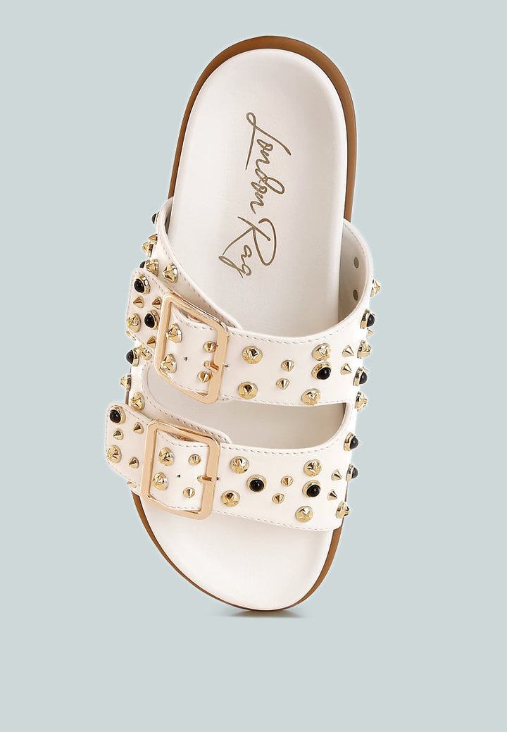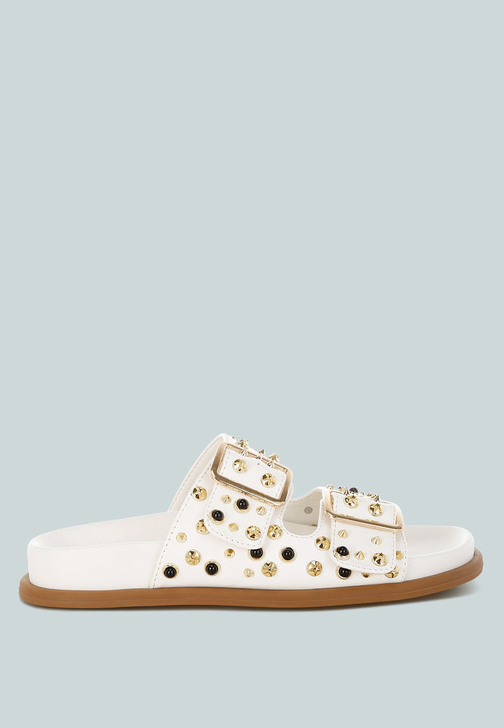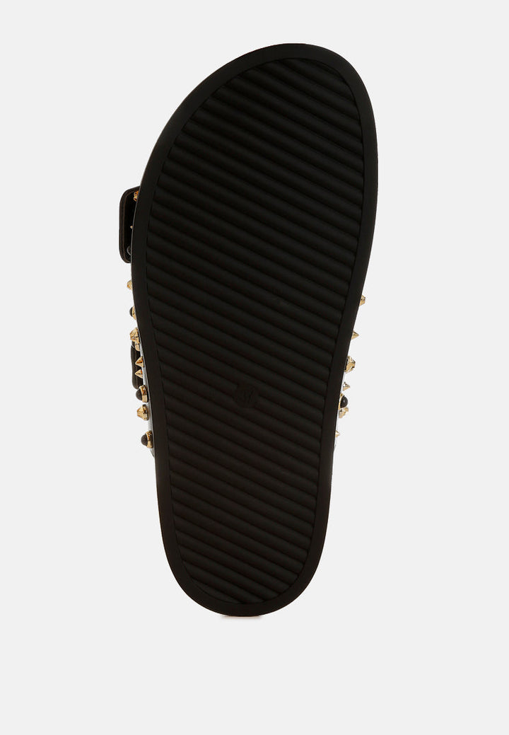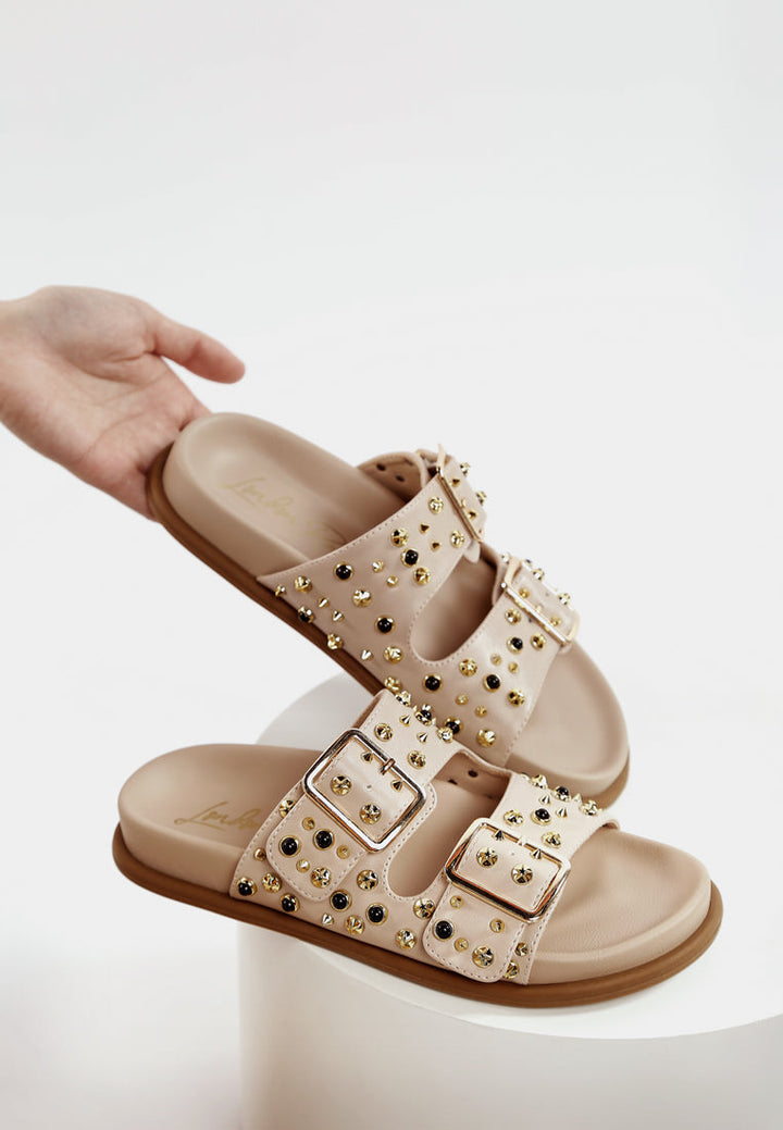 Bling it on with these sliders featuring metallic stud embellishments all over the straps. The adjustable pin buckle fastening and the soft cushion insole makes them a practical choice for all day comfort. Team these sliders with your casual fits to evening-ready ensembles, be prepared to steal the spotlight.