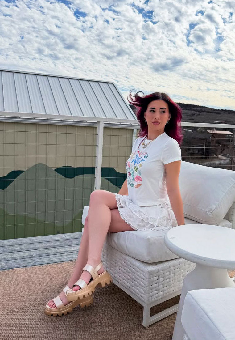The chunky sandals are perfect when you're looking for comfort but also style. The lug sole gives the sandals a rugged look while the metallic exterior gives the shoe a glamorous touch.