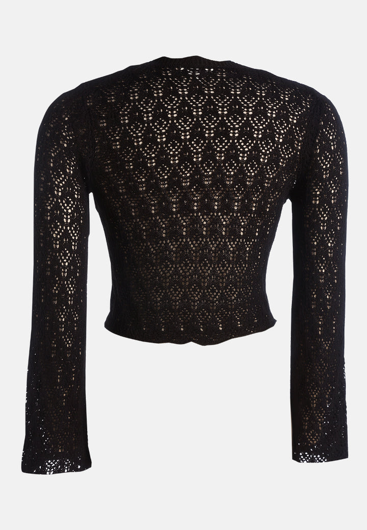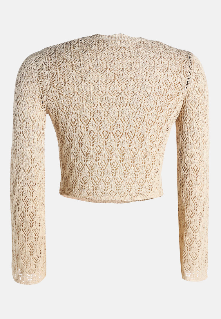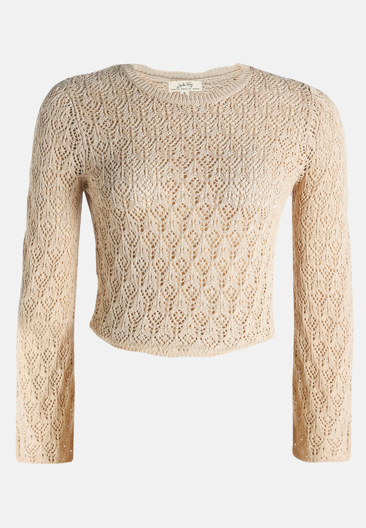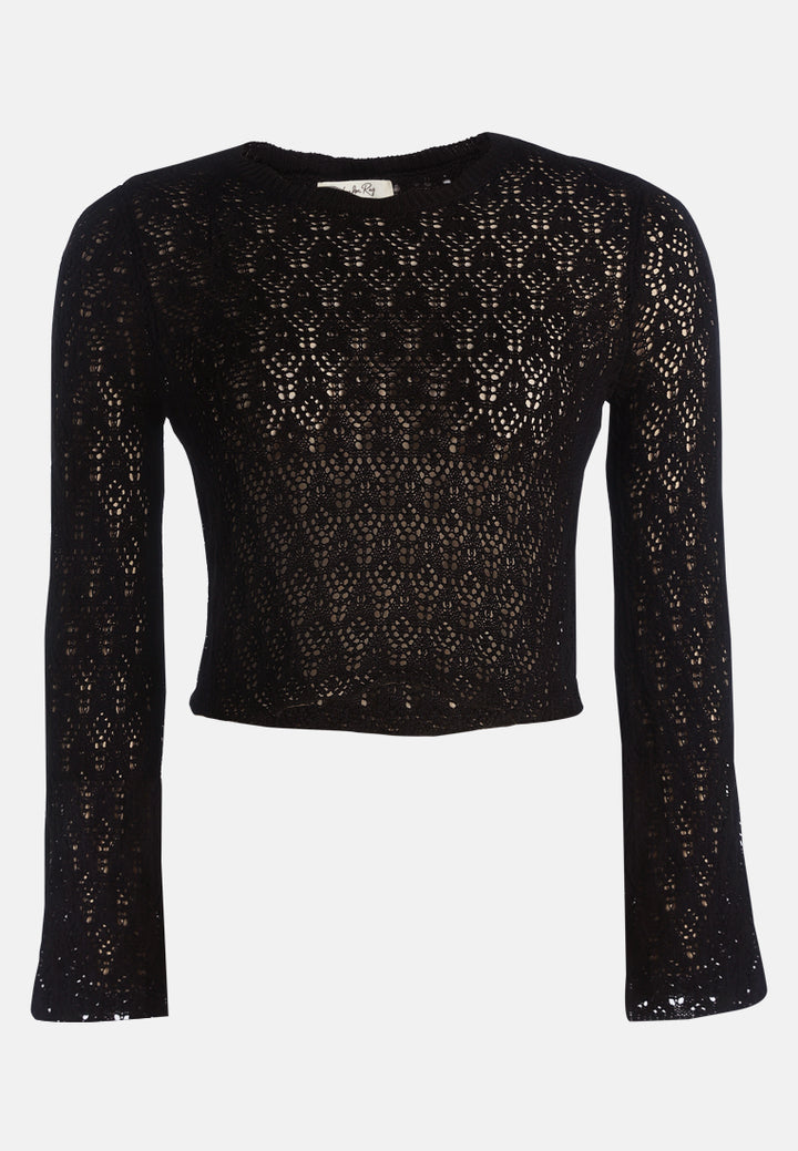 Time to add a touch of boho to your closet! This super cute short sweater top features a cut-out detail crew neckline and lettuce trim. The mesh detailing throughout the top adds drama, while the full sleeves make it perfect for pairing with denim or skirts!