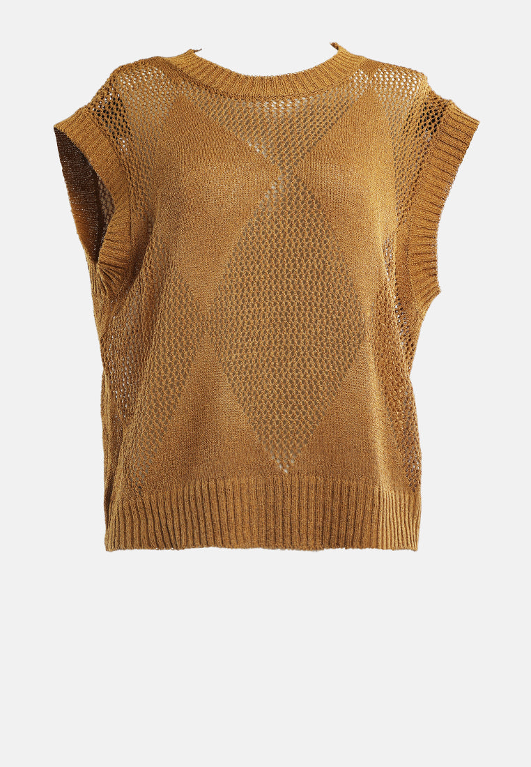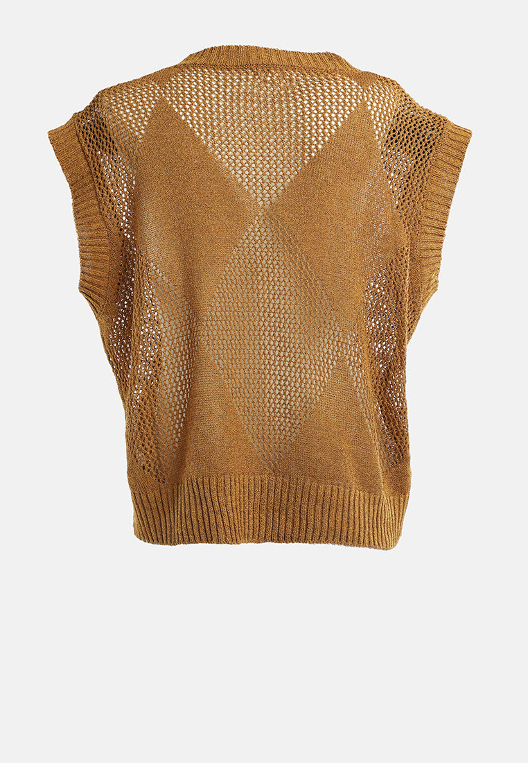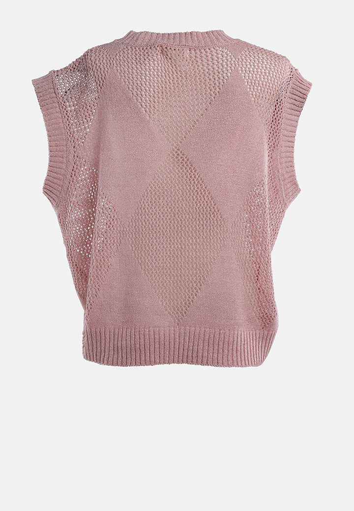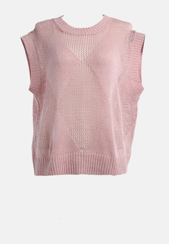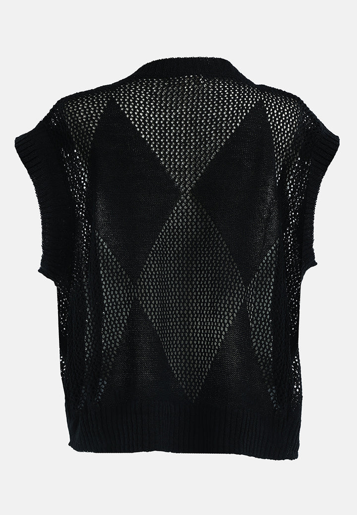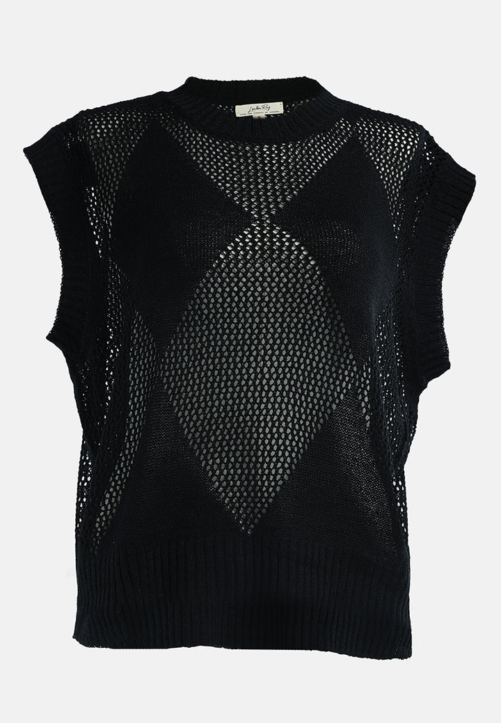 Mesh see-through stylish knitted top. The sleeveless top feels cozy and light. For a more relaxed appearance, it would look amazing paired with a white shirt underneath and some trousers and platform boots for an effortlessly fashionable look.