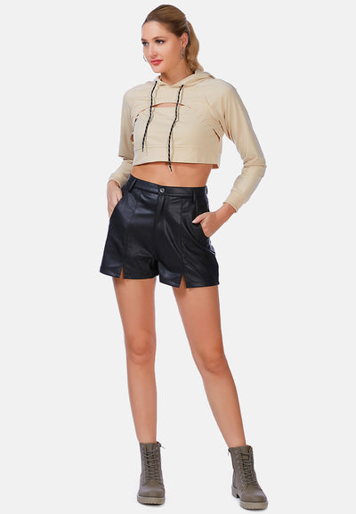 A lightweight trendy piece of a cropped hoodie with a slit at front. Knitted in 100% Cotton