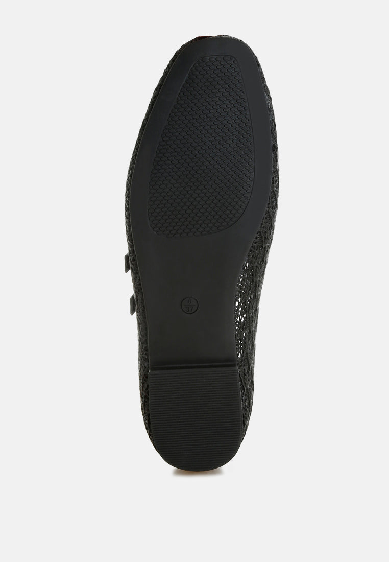 Designed for ease and style, these square-toe ballerinas feature a soft cushioned insole and adjustable pin-buckle midfoot straps for a snug fit. The woven raffia paired with premium faux leather adds an anomalous touch, making them a go-to unique pair.