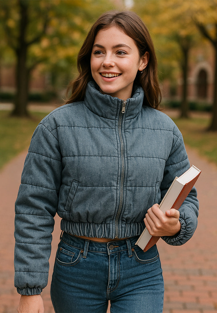 Your puffer jackets don't have to be monotonous and this eccentric short denim puffer jacket is such a statement piece with the mid-out visual texture of the denim and the puffy paneling. The elasticated cuffs and hem ensure the jacket has a secure overall fit and the zipper closure is convenient.